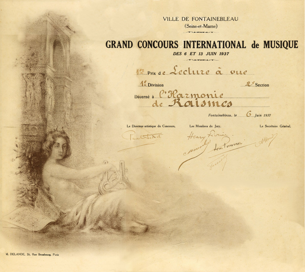 1937 : Nouvel essor de la musique, qui compte à cette époque pas moins de 120 exécutants et remporte, le 6 juin 1937, le 1er prix du concours national de Fontainebleau.