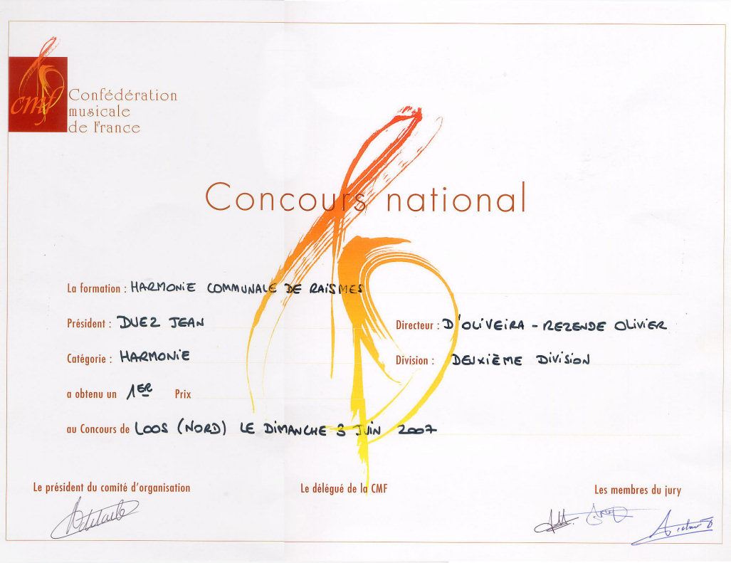 En Juin 2007, L'harmonie passe le concours de la C.M.F à Loos et un obtient un 1er prix en 2me division.